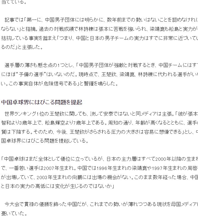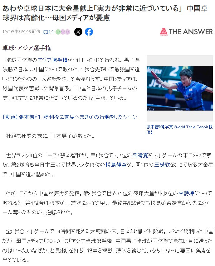 日本媒体《The Answer》总结了本次日乒男团亚锦赛VS国乒男团,文中写道,日本队2-3负于中国队,虽然一度2-0大比分领先但还被大逆转,可中国媒体嗅到了危机,不少中国媒体都认为日乒男队与国乒男团的实力已经非常接近。